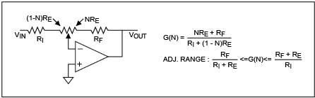 通過在輸入路徑和反饋路徑上增加電阻,最小增益(其中N = 0)升高,最大增益(其中N = 1)降低,有效地壓縮了可用的增益范圍。例如,在所示的曲線圖中,增益可以從1調(diào)整到3而不是從0到255對(duì)應(yīng)的電路4。