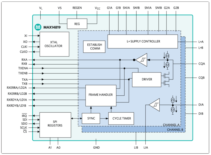 雙IO-Link主收發(fā)器可配置為使用外部UART或使用IC上的集成成幀器。