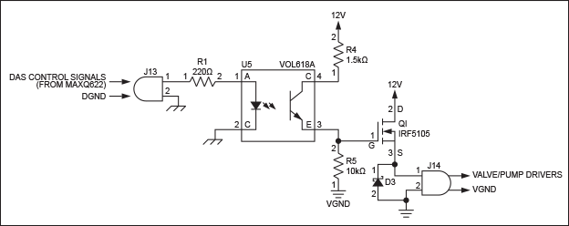 U5的光電晶體管輸出激活功率MOSFET Q1,并提供操作閥門或泵所需的高電流驅(qū)動(dòng)。光耦合器U5是DAS PCB對(duì)來(lái)自大功率驅(qū)動(dòng)器PCB的任何干擾的高精度控制的經(jīng)濟(jì)有效的電流隔離手段。