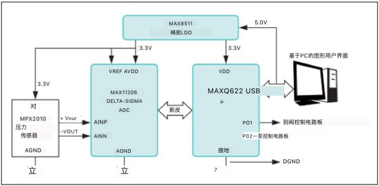 在其輸出端,壓力傳感器產(chǎn)生的壓力等效電壓由MAX11206 ADC測(cè)量和數(shù)字化,由集成的MAXQ622微控制器處理,最后通過(guò)USB電纜發(fā)送到PC。然后,基于PC的控制和分配GUI向DAS發(fā)送遞送請(qǐng)求,其激活閥驅(qū)動(dòng)器PCB以遞送由軟件預(yù)定義的一定量的液體。DAS還向泵驅(qū)動(dòng)器PCB提供控制信號(hào)以打開/關(guān)閉,從而保持恒定的液體高度。