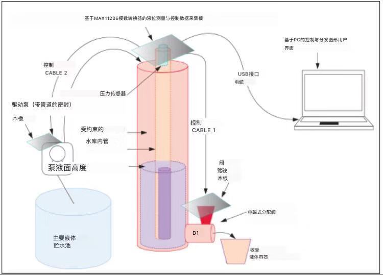 薄測(cè)量管位于主液槽內(nèi),并直接連接到傳感器的正壓端口??刂艱AS PCB直接連接到壓力傳感器,可以動(dòng)態(tài)測(cè)量液位。來(lái)自基于PC的控制和分配GUI的控制信號(hào)激活閥驅(qū)動(dòng)器PCB和泵驅(qū)動(dòng)器PCB,因此它們將規(guī)定量的液體輸送到接收液體容器??刂坪头峙銰UI還向水泵提供控制信號(hào)。主液體儲(chǔ)存器儲(chǔ)存補(bǔ)充和維持受控液體儲(chǔ)存器所需的液體。