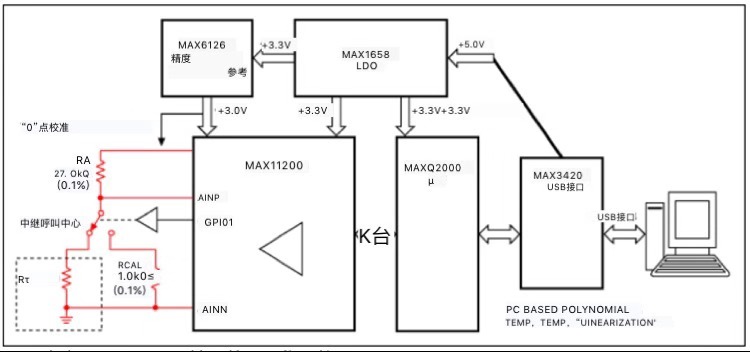 請注意,PRTD應用中的輸出信號總范圍約為82mV。MAX11200具有極低的輸入?yún)⒖荚肼?,功率?70nV(10sps),使應用在210°C范圍內具有0.007°C的無噪聲分辨率。