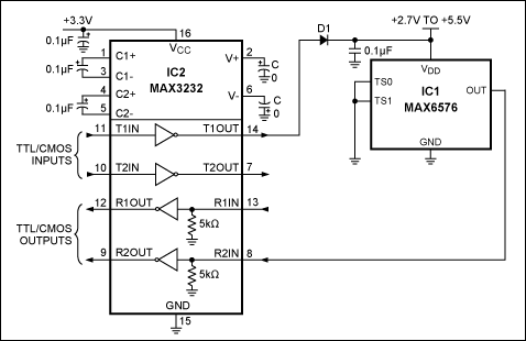 圖1顯示了一種通過RS-232接口電纜連接溫度傳感器的非常簡單的方法。傳感器IC1的電源(6V /250μA,最大值)由3V供電的RS-232發(fā)送器IC2的一個驅(qū)動器輸出提供。IC的驅(qū)動器輸出電壓可調(diào)節(jié)至±5.5V,完全兼容RS-232,但在線路末端向接收器提供最小電流。用戶可以從RS-232輸出吸取的電流量大于1mA。(RS-232表明接收器輸入端的電壓必須高于±3V,接收器輸入阻抗最小為3kΩ。)二極管D1有助于將IC1電源電壓降至+ 5V,同時還可防止反向電壓。