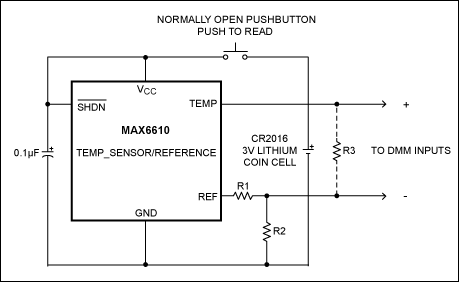 任何數(shù)字電壓表或手持式數(shù)字萬用表都可以作為讀數(shù)。所需的電源電壓約為3V,因此合適的電源可以是兩節(jié)AA堿性電池或鋰幣型電池。典型的電源電流約為0.2mA。CR2016型電池可以連續(xù)運行電路數(shù)百小時,如果電路配有常開按鈕,可以連續(xù)運行幾年,如圖所示。
