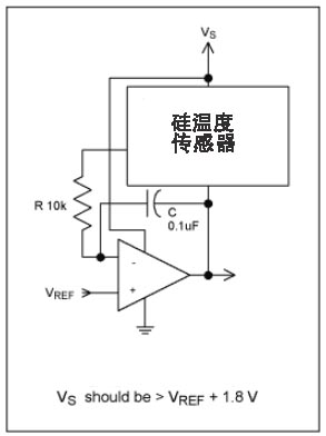 溫度傳感器兩端的電壓絕不能低于傳感器的最小額定電源電壓。該最小值出現(xiàn)在預(yù)期的最冷溫度下,傳感器的負極引腳最為正。傳感器件的最低工作電壓(1.8V)可以緩解這種限制。因此,V S必須始終比V REF至少高1.8伏。由于此電路會改變傳感器的電源電壓,因此傳感器會引入一個與電源抑制比成比例的額外誤差。