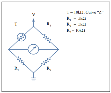 另一種利用熱敏電阻的方法測量溫度是使用惠斯通用熱敏電阻橋接作為橋梁的一條腿。圖2中的電路是電路的一個例子利用熱敏電阻來