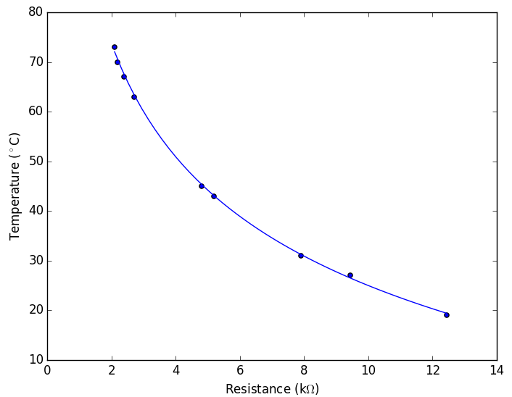 在太陽能熱水器控制器項(xiàng)目的情況下,我測量了未知熱敏電阻在多個(gè)溫度下的電阻,并從連接到熱敏電阻的設(shè)備讀取溫度,因?yàn)槲覠o法測量熱敏電阻所在的實(shí)際溫度。理想情況下,我會(huì)以一碗水和溫度計(jì)的形式使用已知的溫度。
