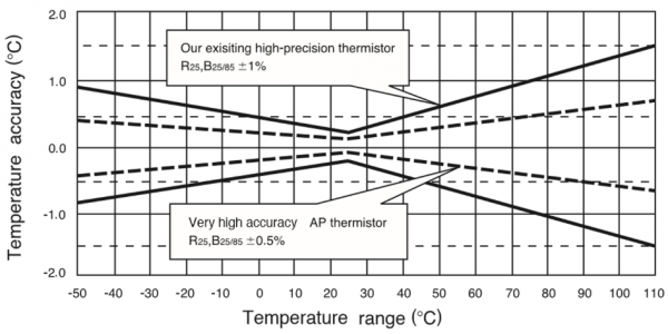 熱敏電阻具有更高的精度,其額定溫度為150°C Tmax。它具有-60?C至+80?C的0.5%電阻容差,可用于從電池充電器到溫度傳感器的各種應(yīng)用。