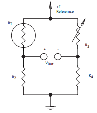 進(jìn)入電橋的電壓應(yīng)在2伏的范圍內(nèi),以保持熱敏電阻的任何自熱至少。橋電路中的R2和R4應(yīng)該具有相等的值,并且在其中點(diǎn)處等于RT預(yù)期溫度范圍。 對(duì)于0°至50°C范圍(32°至122°F),選擇10K歐姆電阻。
