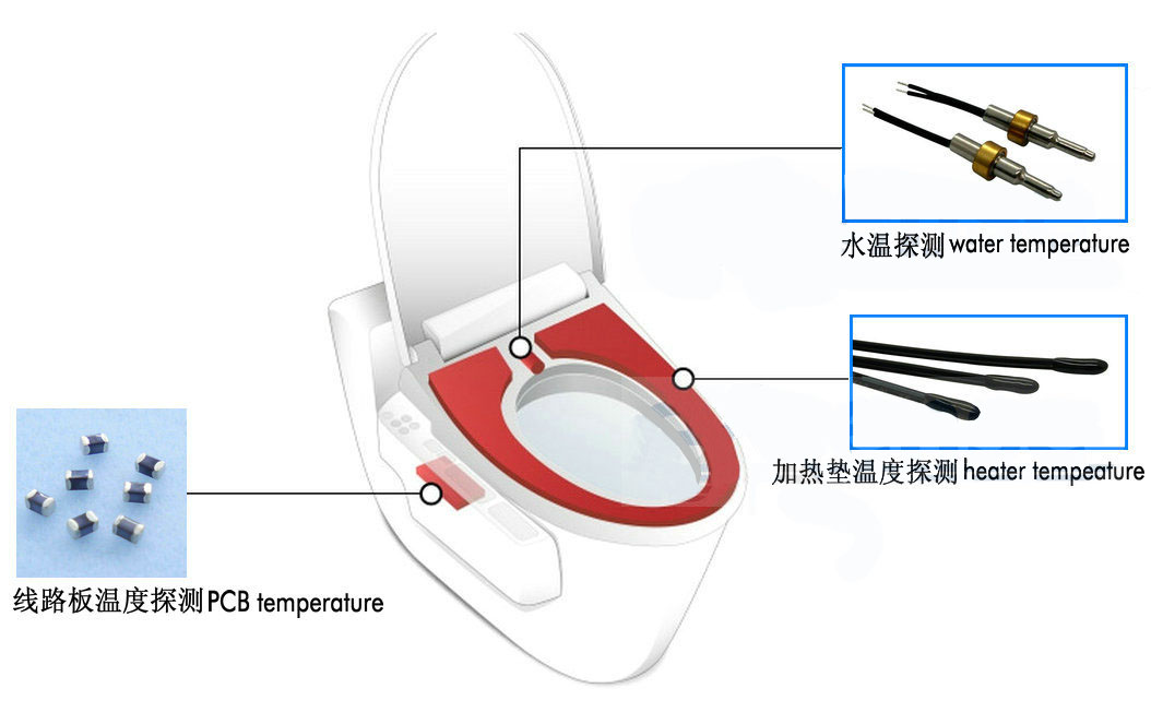 NTC溫度傳感器是智能馬桶的重要組成部分,有三種溫度傳感器在智能廁所中起著重要作用,如下圖所示: