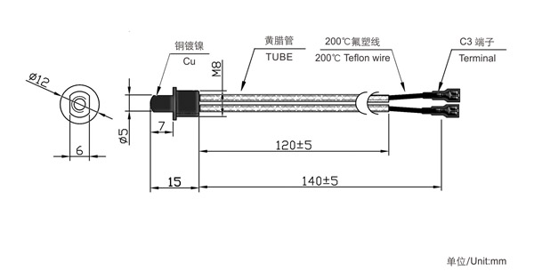 NTC型號(hào)MCW-C129,名稱:內(nèi)螺紋電水壺溫度傳感器;采用MF58NTC熱敏電阻芯片(R25℃=100KΩ±1% B25/50=3950K±1%),銅鍍鎳為法蘭狀設(shè)計(jì)內(nèi)螺紋外殼安裝且導(dǎo)熱速度快。導(dǎo)線為為而高溫200℃的鐵氟龍線,NTC和導(dǎo)線聯(lián)接處外包一層黃臘管,尾部接標(biāo)準(zhǔn)端子一枚,長(zhǎng)度可定制。。溫度傳感器便于適用溫度-30~250℃,是一款耐高溫的測(cè)溫NTC。